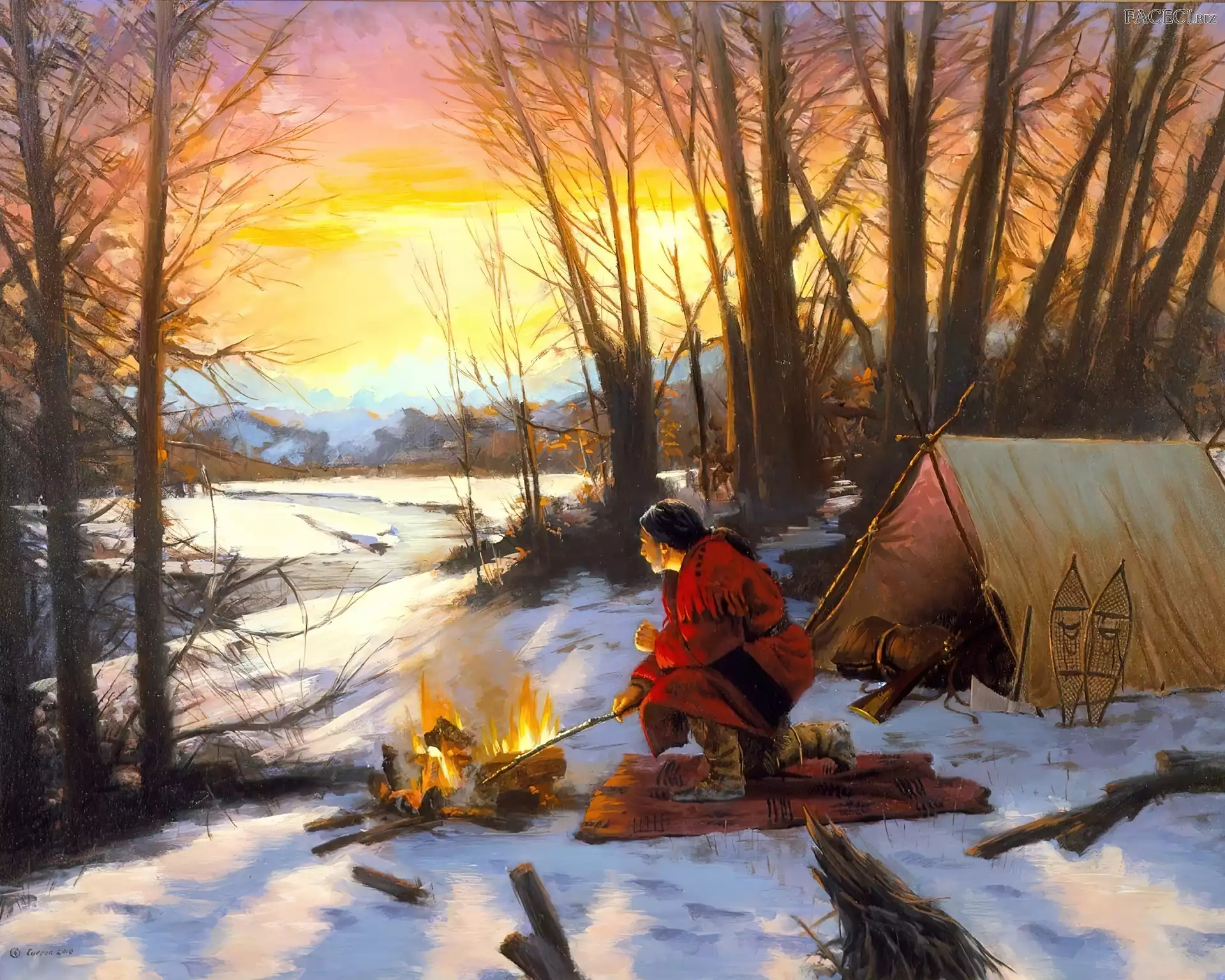 Słońca, Ognisko, Mężczyzna, Zima, Zachód, Traper, Namiot - faceci.biz